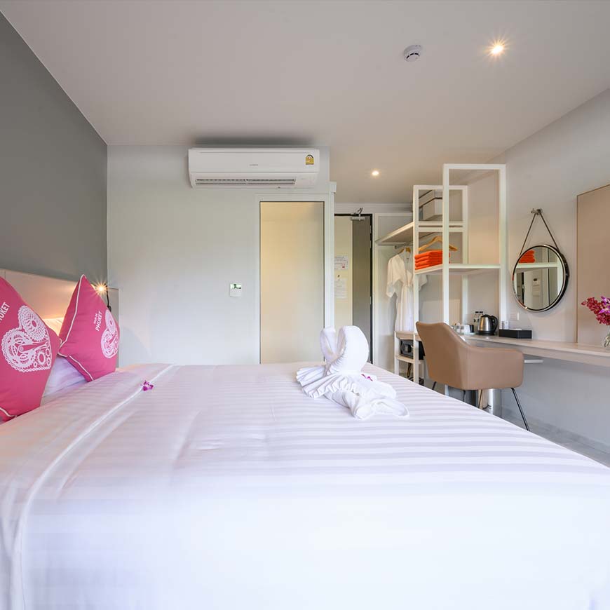 The Deluxe Jacuzzi Rooms have flat screen TV’s, air conditioning, tea/coffee facilities, in-room amenities, rain showers, safety boxes and more, so if you’re looking for a modern, clean and artfully designed room in the heart of Phuket and a great place to enjoy all the adventures that Phuket has to offer, look no further than the Deluxe Jacuzzi Room at Tour de Phuket in Choeng Thale.